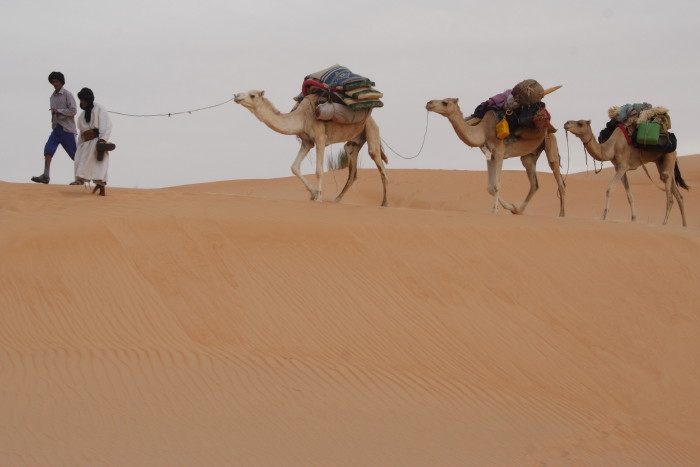 Sans les dromadaires, nous ne pourrions pas aller bien loin dans la mer de sable. Pendant la longue marche de la journée, ce sont eux qui transportent tout le matériel dont nous avons besoin pour le campement. |
